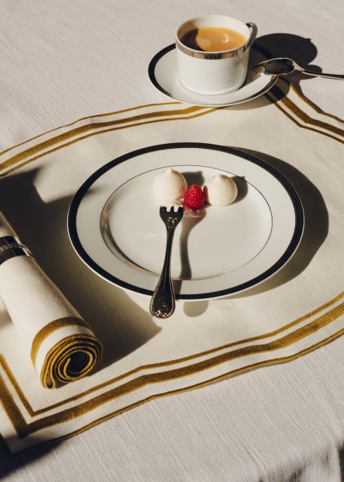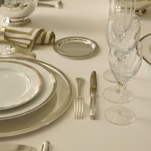 The Malmaison silverware collection embodies the classical elegance of the Empire style. Its symmetrical motifs, alternating water leaves and palmettes, are emblematic signatures of Christofle’s unique craftsmanship. The Maison later extended the Malmaison collection into fine porcelain tableware. The iconic motifs appear on a white background, evoking a discreet luxury defined by precision and delicacy. Enhanced with gold or platinum, this iconic collection has graced the most refined tables since the early 20th century.