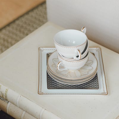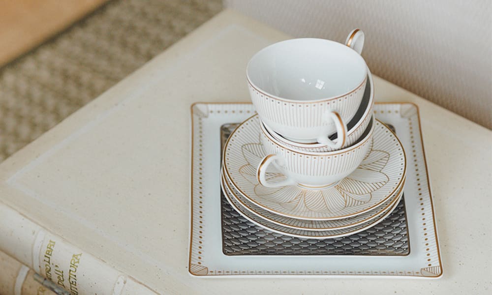 La Maisonétend la collection Malmaison en service de porcelaine fine. On y retrouve les motifs phares sur fond blanc, ils évoquent un luxe discret, nourri de précision et de délicatesse. Cette collection iconique, rehaussée d’or ou de platine, trouve place sur les tables les plus raffinées depuis le début du XXe siècle.