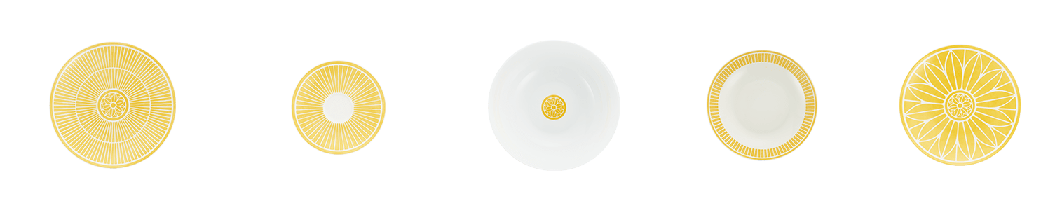 Chaque pièce du service Malmaison Riviera semble capturer le soleil méditerranéen grâce à un jaune aquarellé, vivant et naturel, venant réchauffer et illuminer la table.