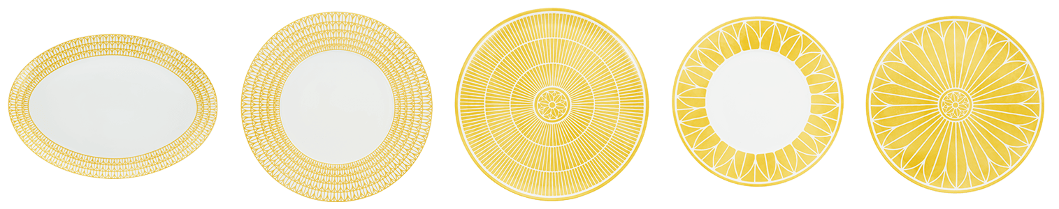 Palmettes, rosaces et rayons évocateurs sont les motifs phares de cette collection Malmaison Riviera. S’ils font écho aux codes esthétiques de Malmaison et Malmaison Impériale, l’aura solaire distingue ce nouveau service en porcelaine.