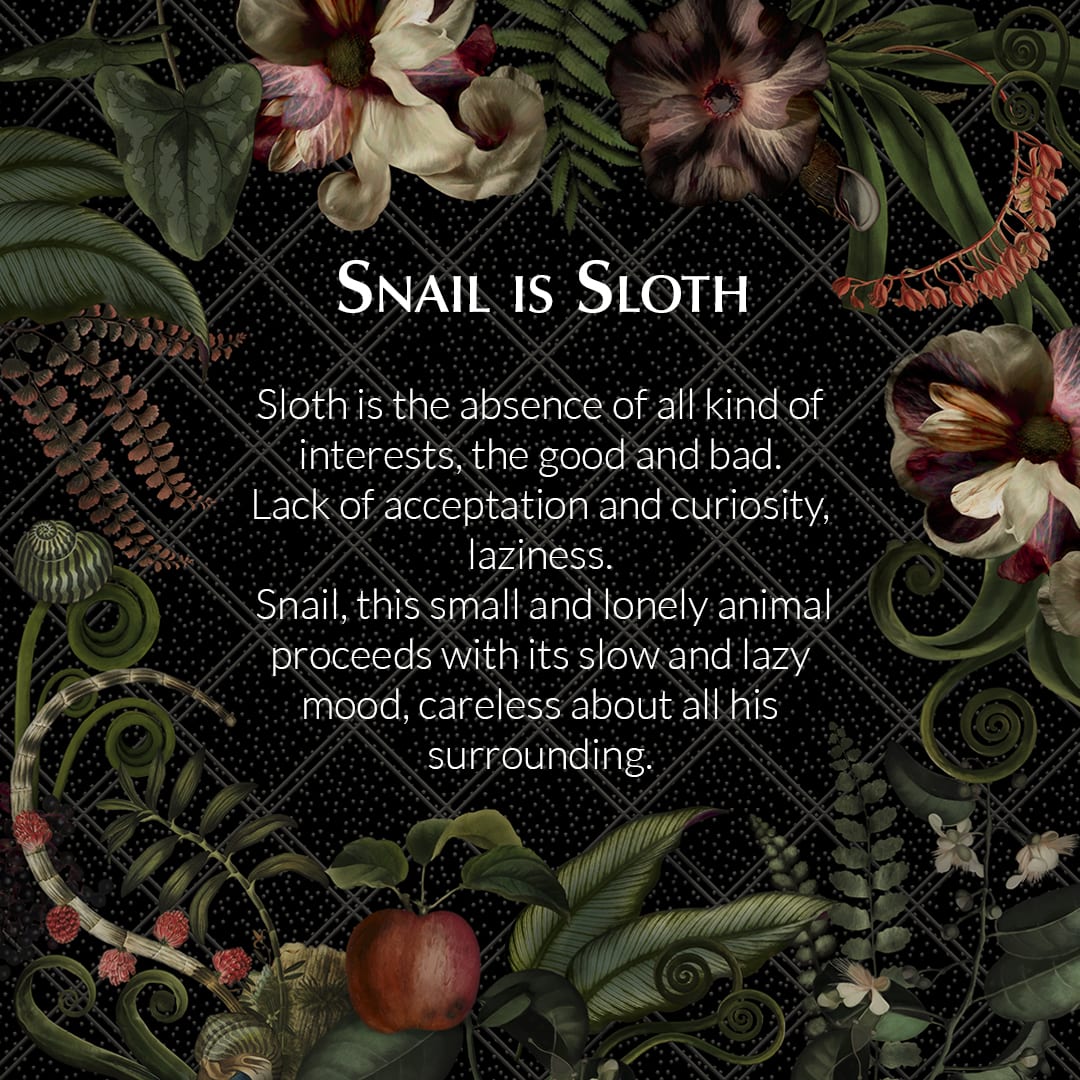 To represent Sloth, a pocket ashtray depicting a small and solitary snail that moves slowly without worrying about the world around it. This beautifully decorated travel-friendly item will hold smoked cigarettes, after a long sensuous pause for reflection. It can also hold candy when you give yourself over to sloth.