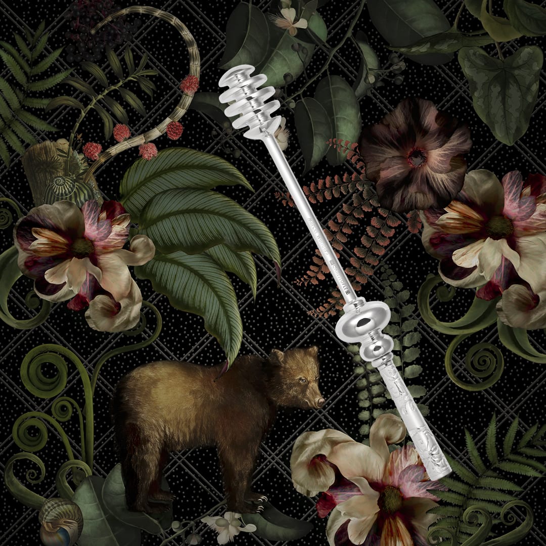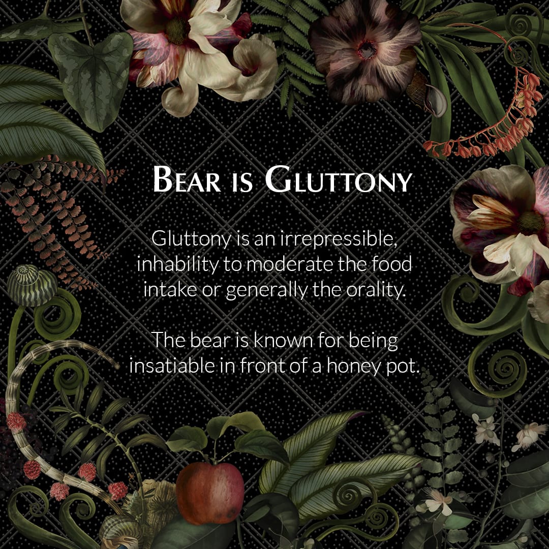 The honey dipper evokes Gluttony, embodied by a bear. This dipper contains an entirely unreasonable amount of honey, to thoroughly satisfy the gluttonous bear that lies dormant within us!