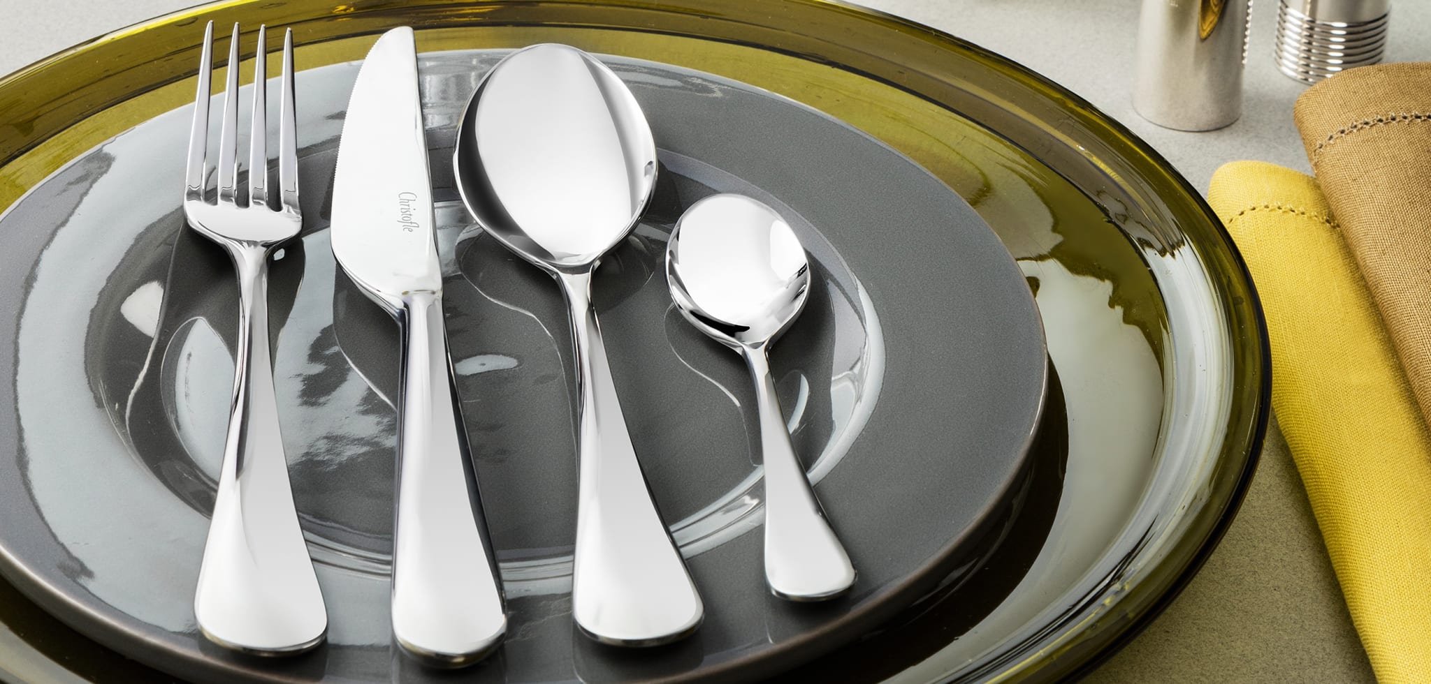 Created in 2009 by the Christofle studio, the Origine cutlery collection offers a contemporary reinterpretation of a traditional model. Origin, for original as for original. The curved design of the cutlery sleeves as well as the short and largely flared blade of the knife make it unique.