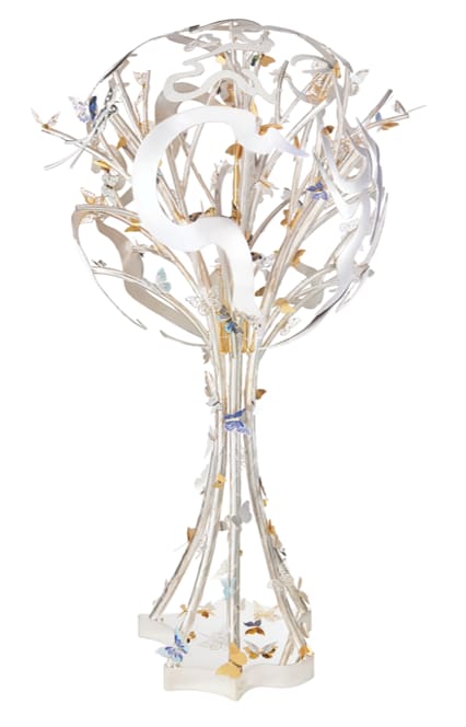 In the end, a tree 2 m high and 1 m in diameter weighs nearly 100 kg, including 1 kg of solid silver and 21 g of gold. It is composed of 37 structural elements and decorated with 142 butterflies.