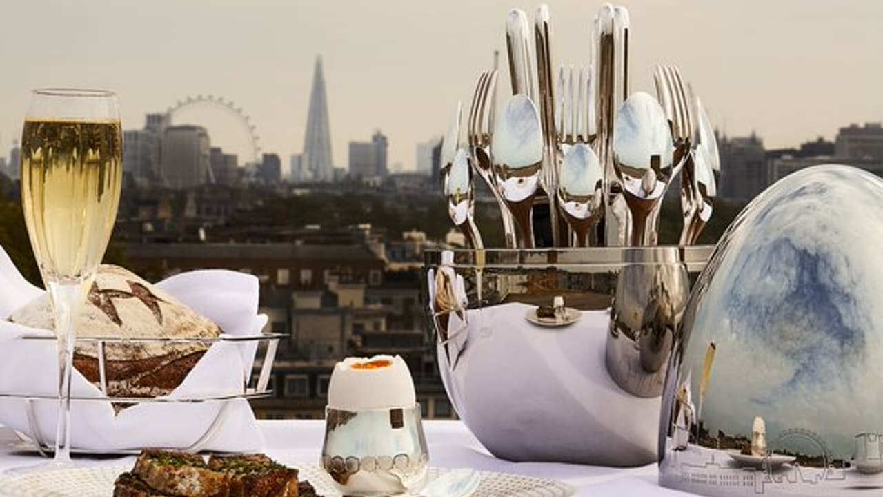 A set of 24 silver-plated metal cutlery pieces housed in an egg-shaped shell measuring 30 cm high and 20 cm in diameter​