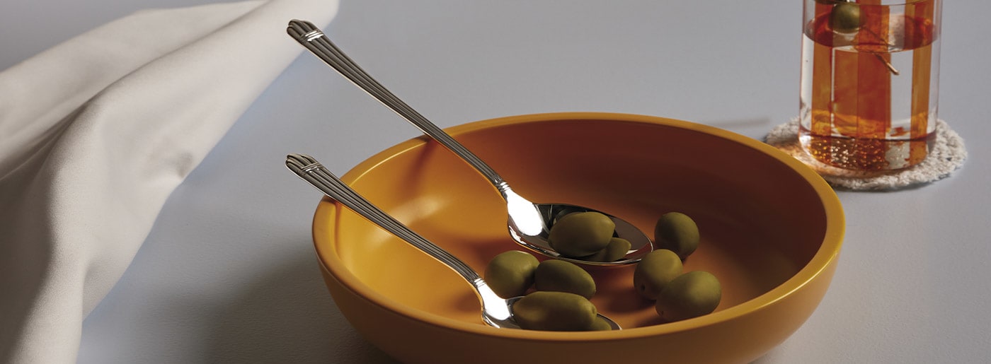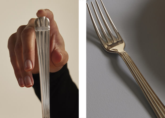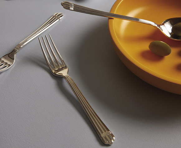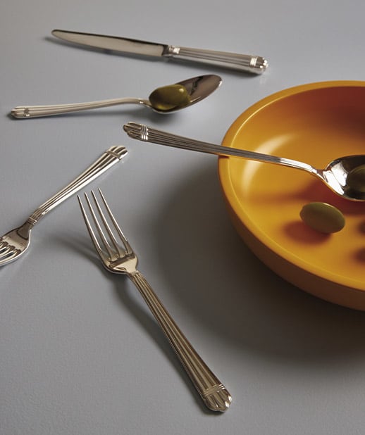 Son motif, représentant un faisceau de joncs liés en haut et en bas du manche, est un hymne à la nature, un aria (‘air’ en italien) que la sobriété de la ligne rend contemporain. Une collection racée, épurée qui enchante toutes les tables, des plus quotidiennes aux plus sophistiquées, que l’on choisisse la version tout argent, ou en dorure partielle.