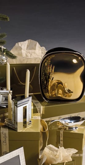 Sous le sapin, la multitude de paquets vert impérial, couleur signature de la Maison, sont autant d’écrins pour les candélabres, brocs à eau, flûtes en cristal, couverts de service, vide-poches ou bijoux en métal argenté.