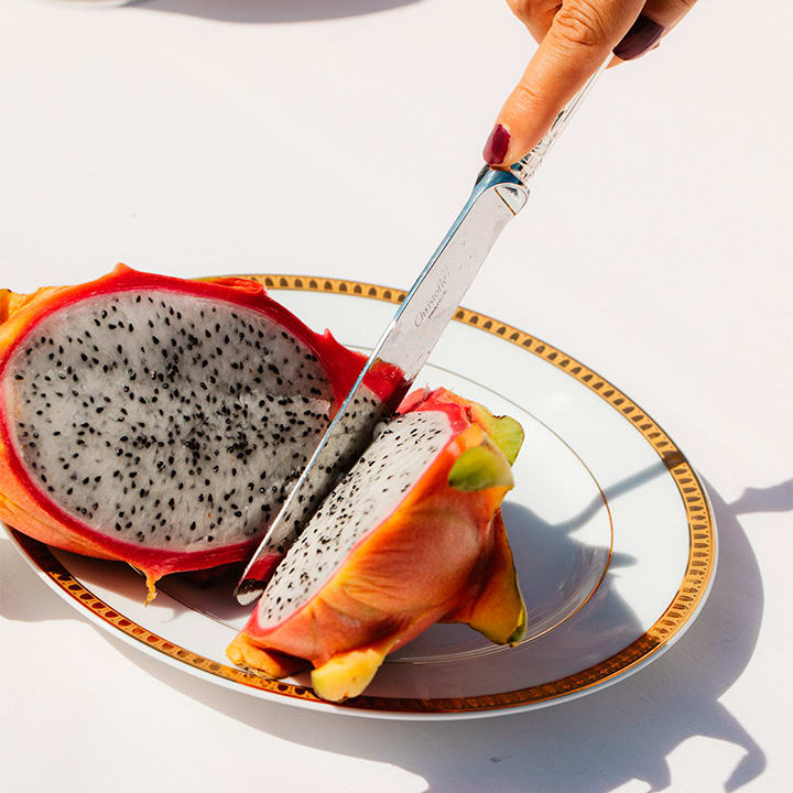 Inspiré des modèles les plus emblématiques de la maison Christofle, le couteau en argent massif est une véritable pièce d’orfèvrerie. Avec la finesse de sa lame et le travail minutieux réalisé sur son manche, il trouve parfaitement sa place sur une table de réception ou au quotidien et sublime ces moments de partage, car au-delà de sa fonctionnalité et de sa praticité, le couteau en métal argenté se caractérise par une allure élégante et raffinée qui accompagne à merveille tous les mets dégustés.