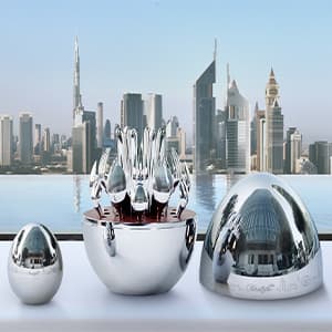 Composé de 24 couverts pour 6 personnes, présentées dans un écrin ovoïde en acier, il est le MOOD idéal.