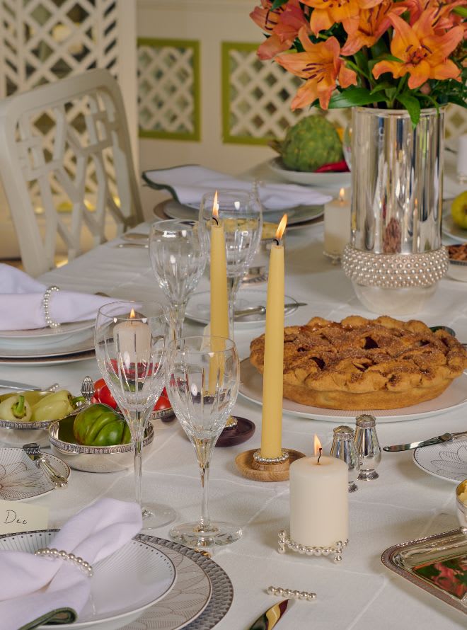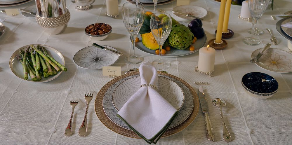 At the heart of the table, a Perles silver vase brims with autumn blooms, while subtle touches like napkin rings, knife rests, and Perles candleholders