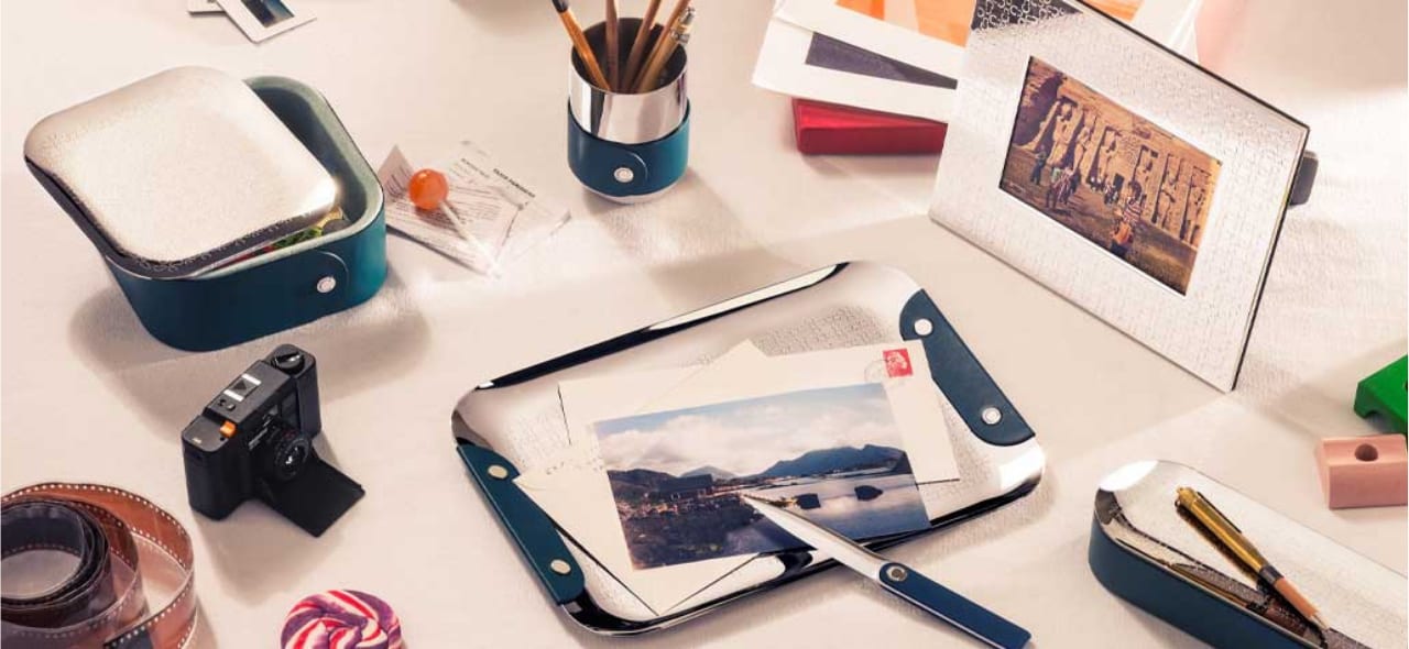 Une boîte plumier, un pot à crayons, une boîte vide-poches, un plateau à courrier, un ouvre lettres et un cadre à photo en métal argenté, décliné en deux formats, forment la collection.