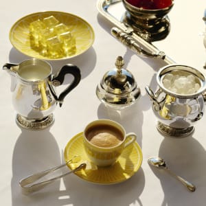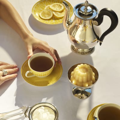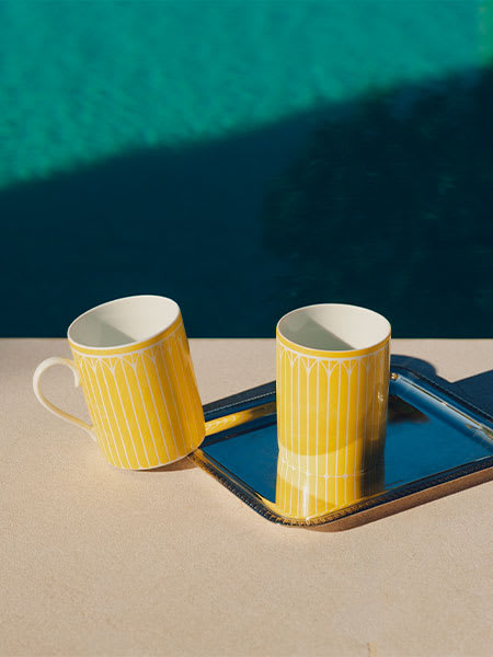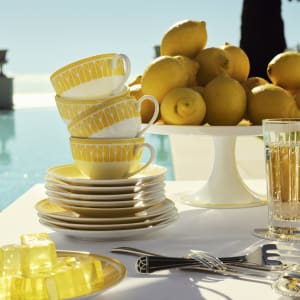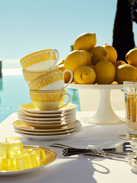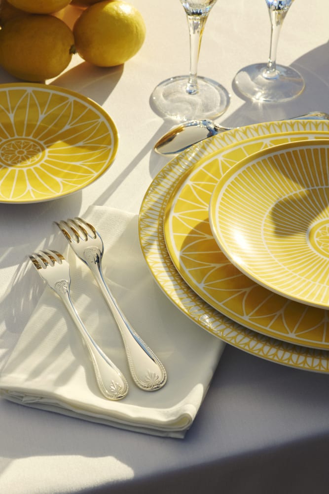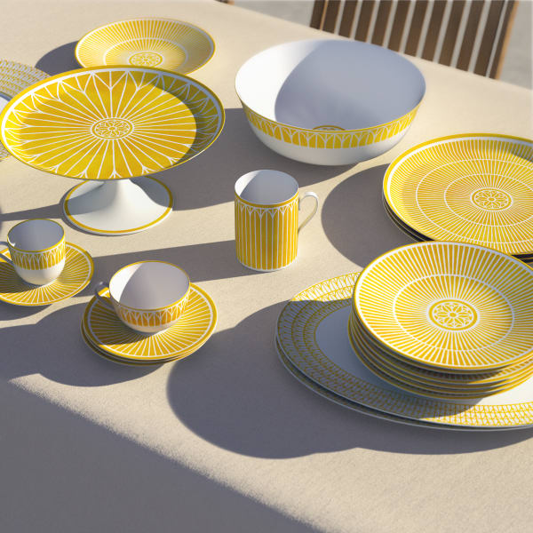 Chaque pièce du service Malmaison Riviera semble capturer le soleil Méditerranéen grâce à un jaune aquarellé, vivant et naturel, venant illuminer la table. Palmettes, rosaces et rayons solaires animent cette collection en porcelaine fine.