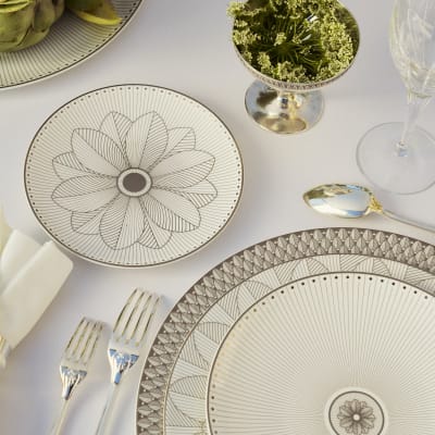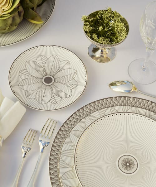 Les codes ornementaux de style Empire sont réinterprétés et modernisés. Les palmettes emblématiques s’épanouissent au centre des assiettes, les rosaces apportent elles un jeu de formes graphiques et cadencées aux intentions florales.