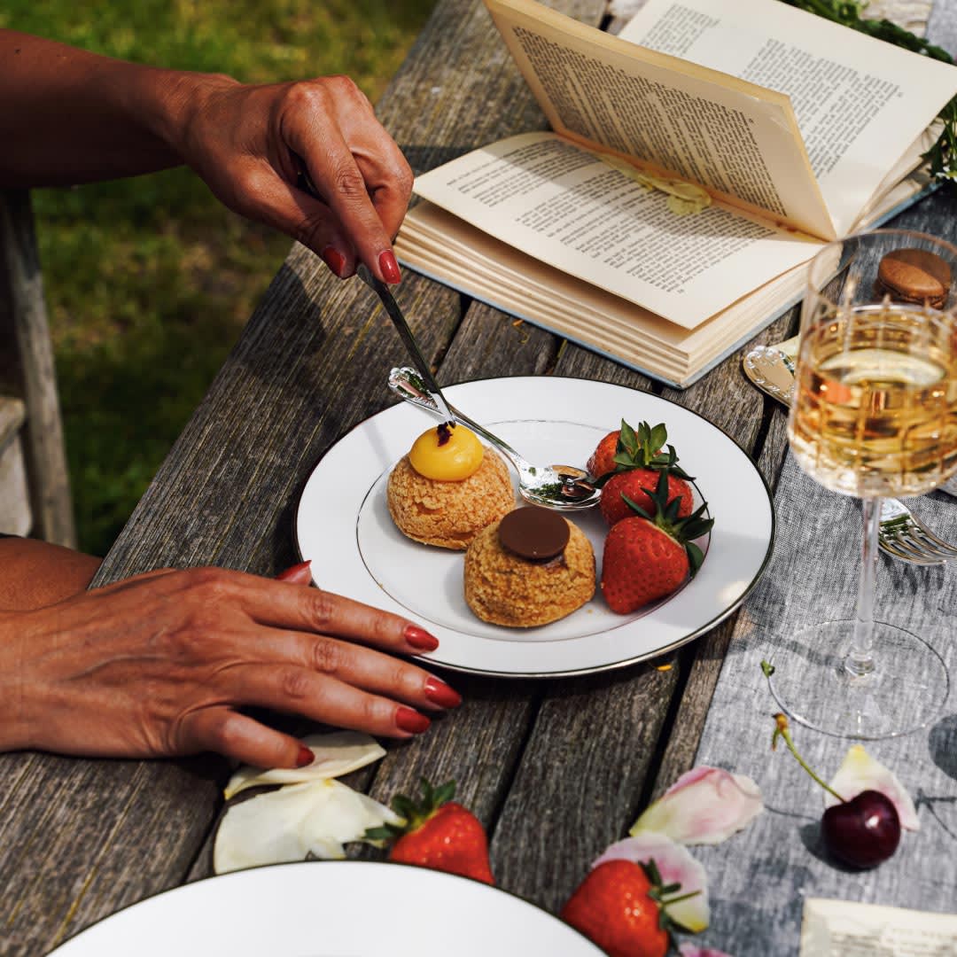 Je voulais recréer le parfait après-midi d'été, un moment qui pourrait presque se perdre dans le temps et dont on voudrait se souvenir à jamais. Un jardin anglais, un verre ou deux d'un bon rosé frais, de délicieux choux et macarons, le tout parfaitement associé à certaines des plus belles pièces de Christofle.