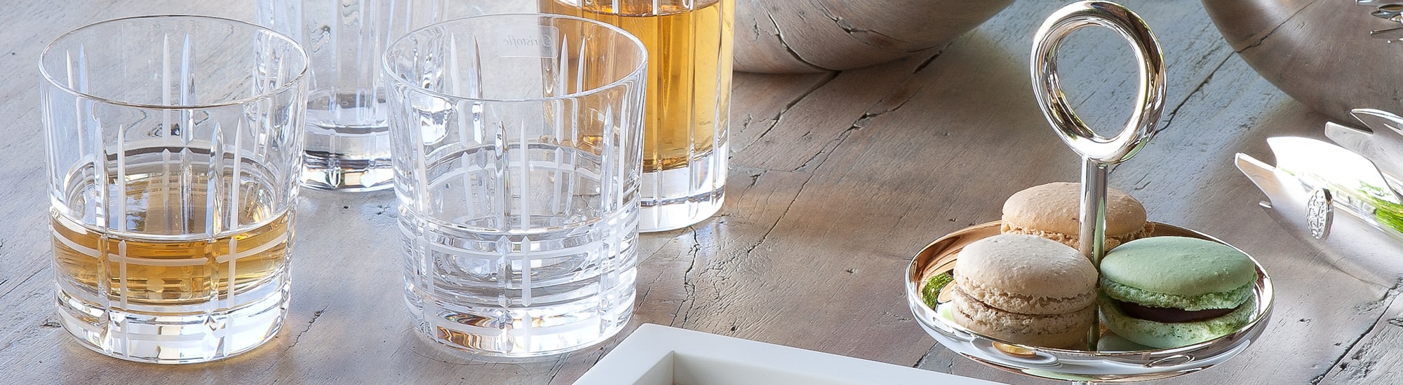Créée en 1997 par le studio Christofle, la collection Scottish propose un remarquable ensemble de cristallerie pour le bar. La collection Scottish se caractérise par ses lignes puissantes et viriles qui révèlent une certaine complexité. Le cristal de chaque pièce est taillé à la main en fins biseaux alternés, polis et dépolis, pour un effet visuel contrastant la brillance au mat. Le croisement de lignes verticales et horizontales, plus ou moins larges et profondes évoque le motif du tartan, typiquement écossais.