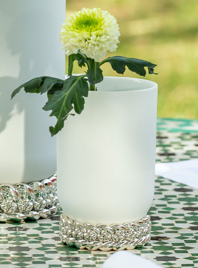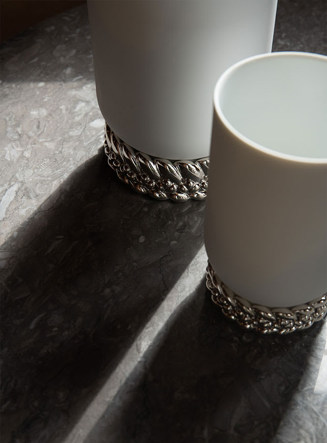 La collection Babylone imaginée par Mademoiselle Aurélie Bidermann est infusée des valeurs chères à Christofle : un art de vivre raffiné, entre classicisme et modernité, dialogue entre riche héritage et appétit du futur, savoir-faire de la grande orfèvrerie française.