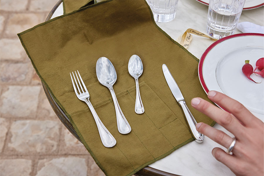 Inspired by the storage pouches that have long been made by Christofle, La Trousse is composes of 4 stainless steel pieces from the Perles collection: a knife, a fork and two spoons (one smaller, for coffee or desserts), elegantly contained within a felt sleeve in Imperial Green, signature colour of the Maison, tied with a ribbon bearing the Christofle initials.