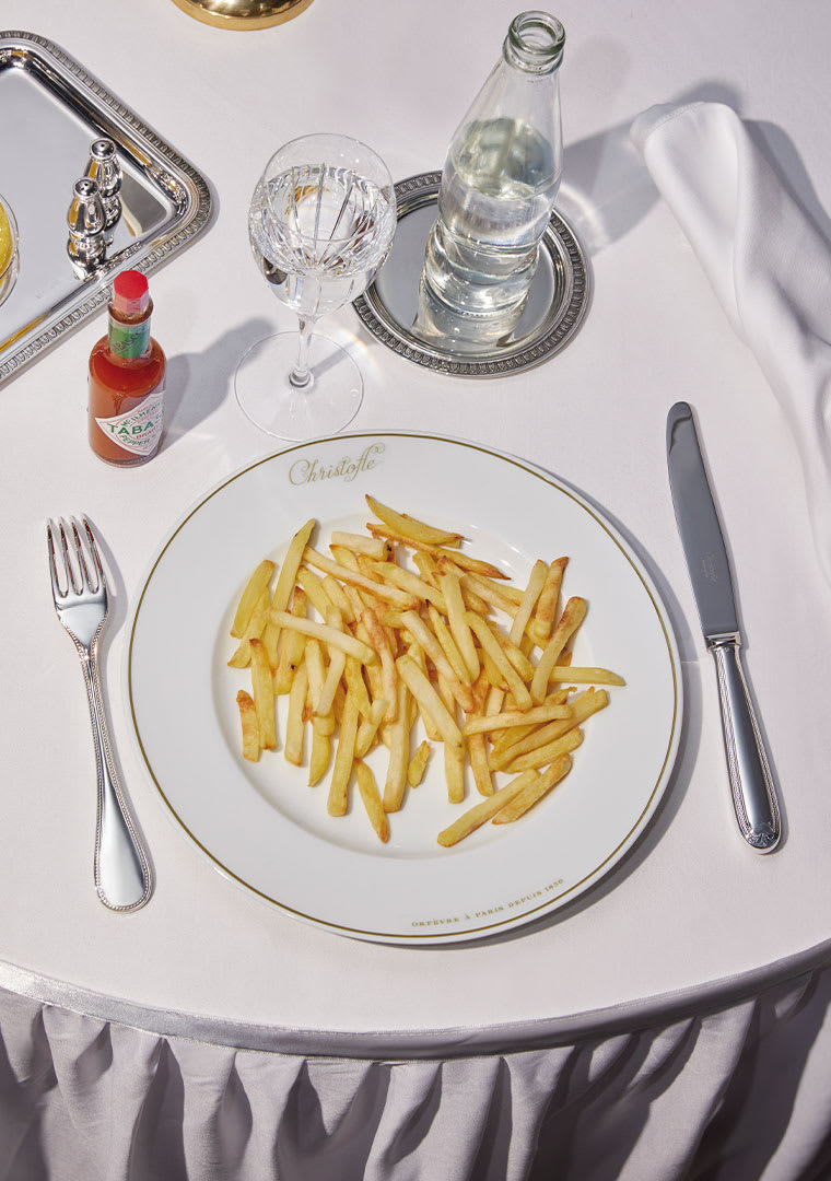 Each piece bears a delicate string of pearls in halfrelief set around its edge with exquisite grace. Like a precious necklace bording each handle, this classic, refined decoration is an unmistakable invitation to a sensory experience. A vibrante homage to luxury à la française.