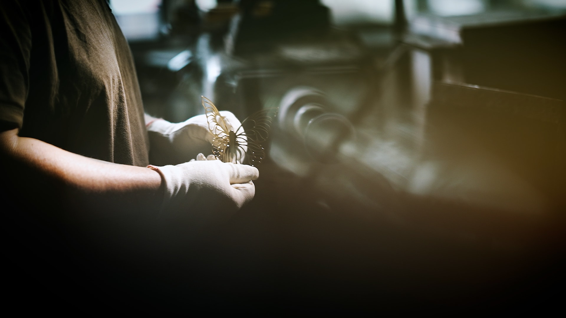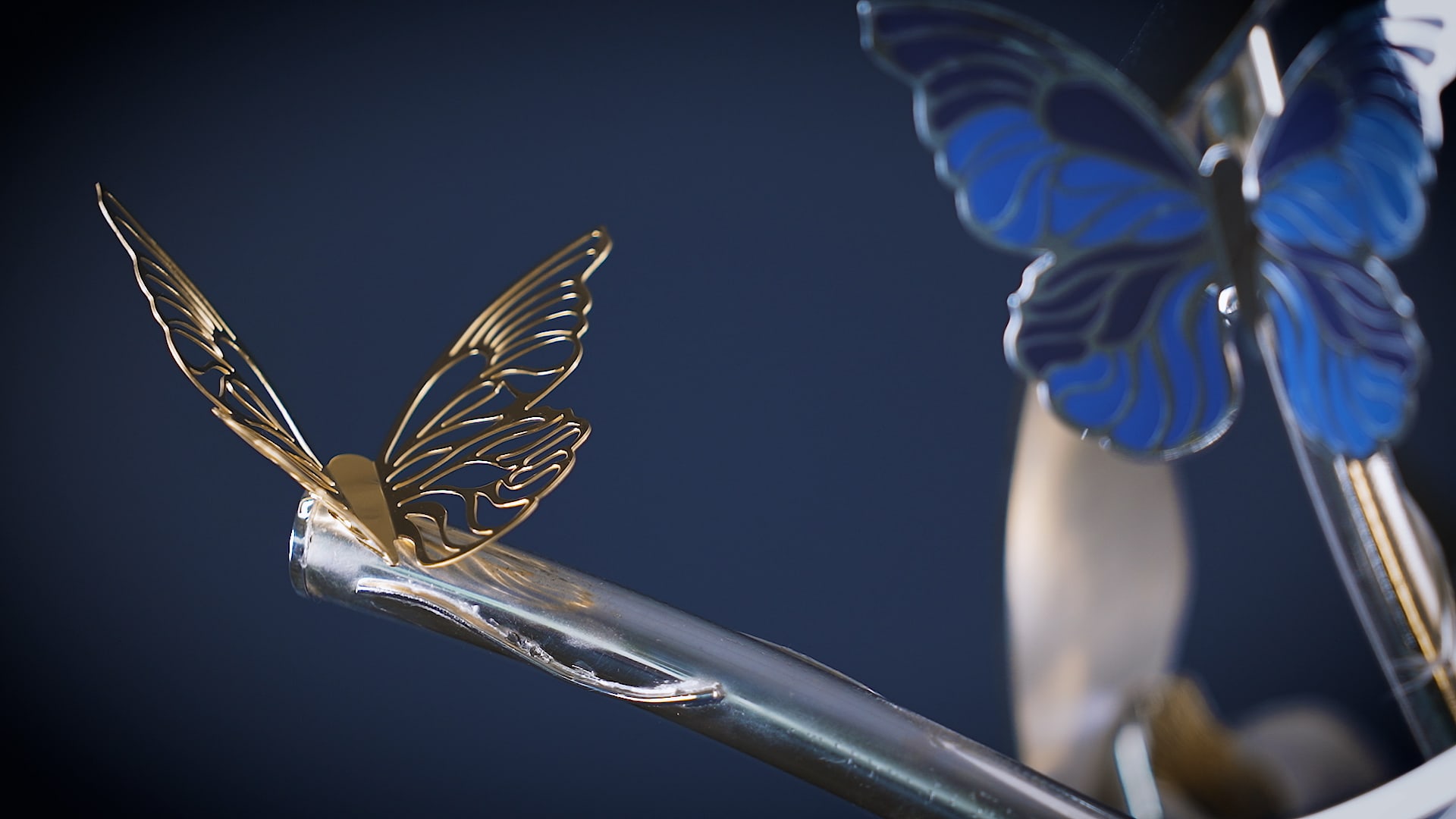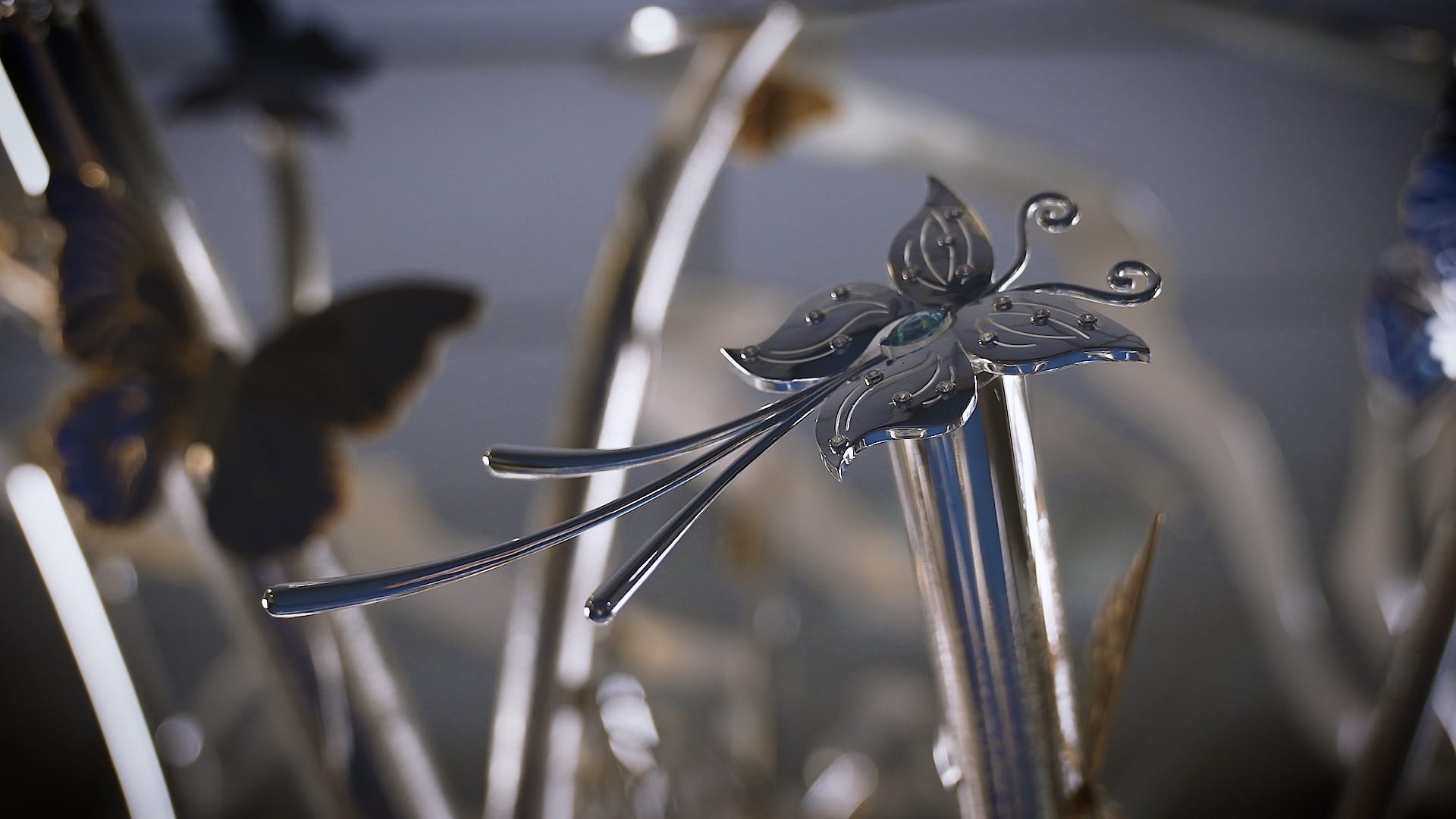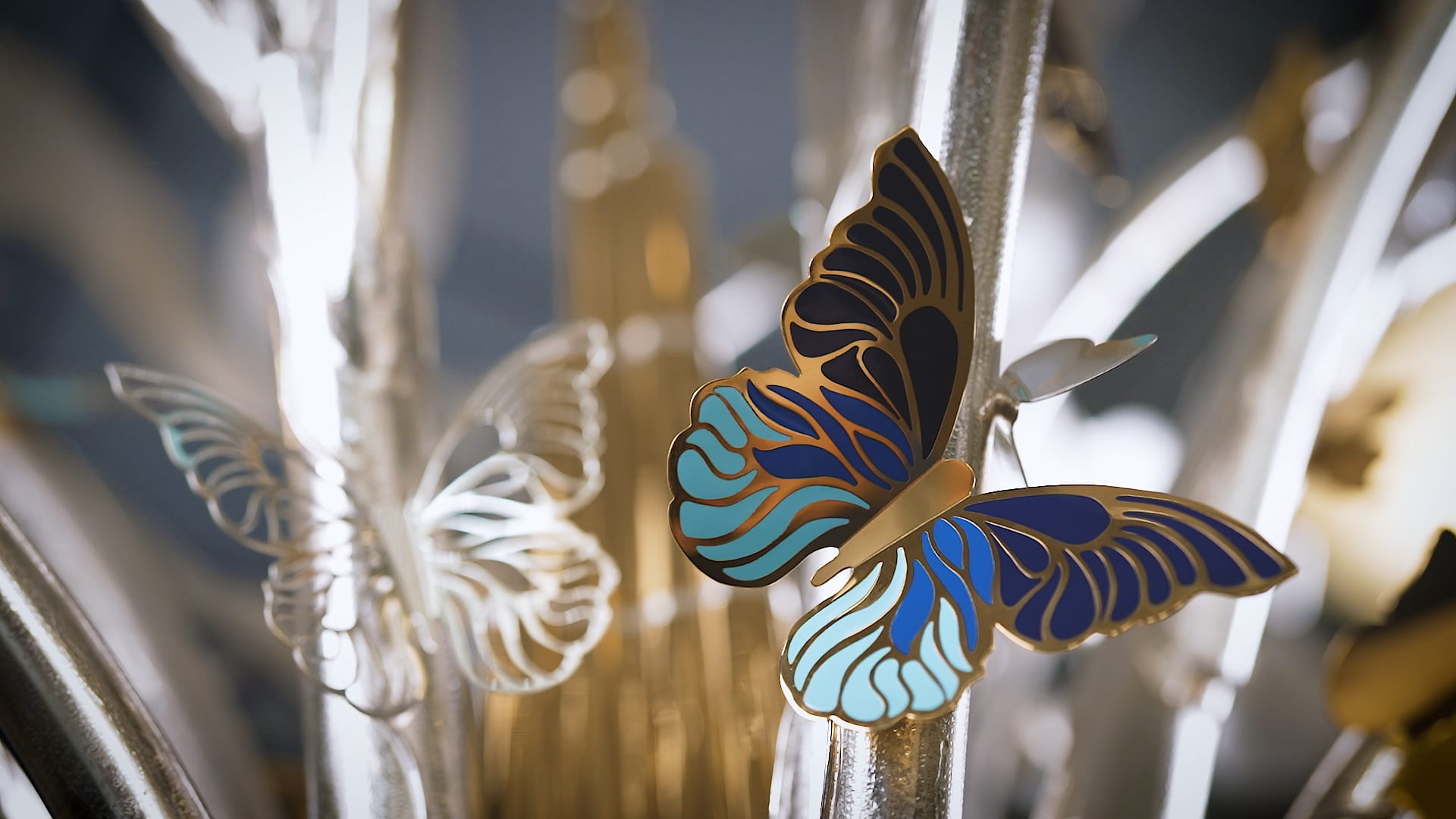 Gold and silver butterflies, lacquered, engraved, openwork or set with stones, adorn the branches, polished and chiselled by hand. Once again, all the know-how of our craftsmen makes this feat possible, playing with the techniques of saving, manual lacquering or setting. An ode to poetry.