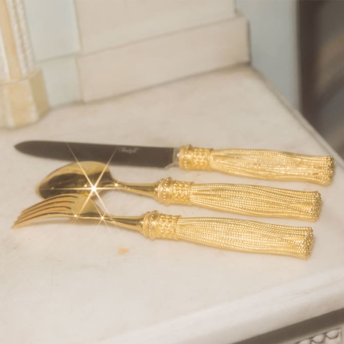 Pompon cutlery are offered by Christofle in silver-plated or gilded. The handles of this cutlery replicate the twisted aspect of the threads making up the pompom, reproducing the idea of the fluid movement of the threads of the passementerie. The entangled threads thus follow curved, irregular, undulating lines.