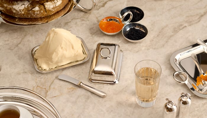 Christofle’s collections range from the ornate Empire style of Malmaison to the contemporary design of Mood, showcasing a refined evolution from heritage to modern tableware.