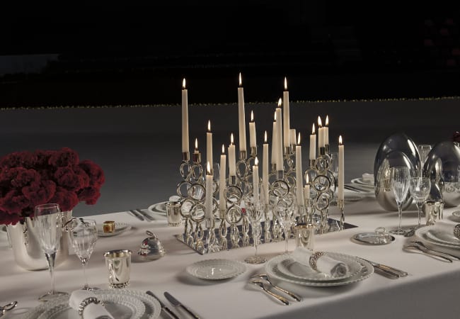 Candlesticks, candleholders, candelabras and photophores contribute to an intimate table setting and will make your table resemble a starry night in complete safety thanks to their glass protection.