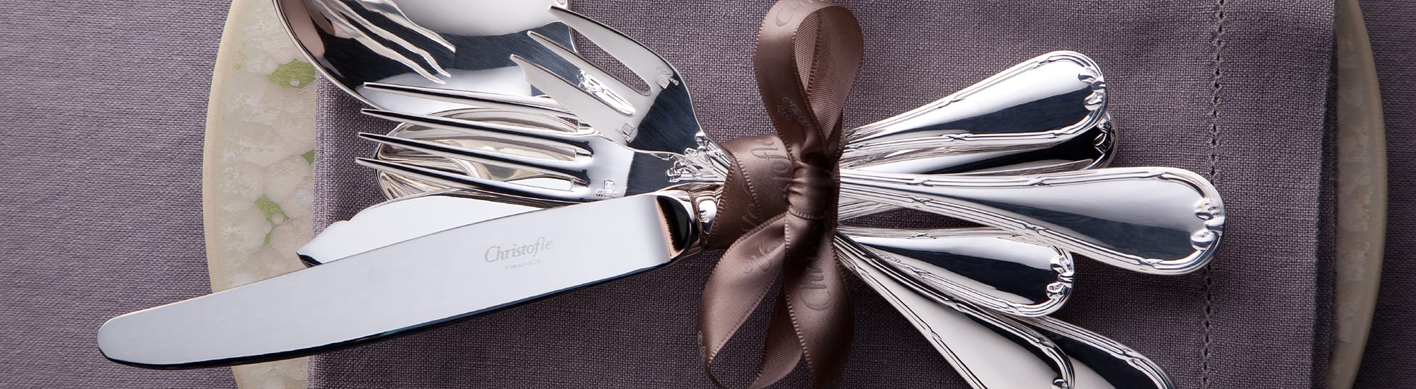 The Rubans cutlery collection irresistibly evokes the romantic charm of the 18th century. It also transports us to the happy memories of large family tables and the joyful sweets of childhood. Created in 1907, Rubans is a Louis XVI style model. The symmetrical decoration of rhythmic nets of crossed ribbons and bows is characteristic of this style.