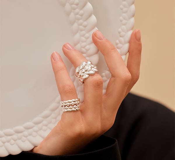 コレクションの代表作 カフブレスレットの流れるような曲線は、エレガンスと柔らかさを表現。高いデザイン性を持ちながら、軽くなめらかな質感と、快適な着け心地を実現しました。