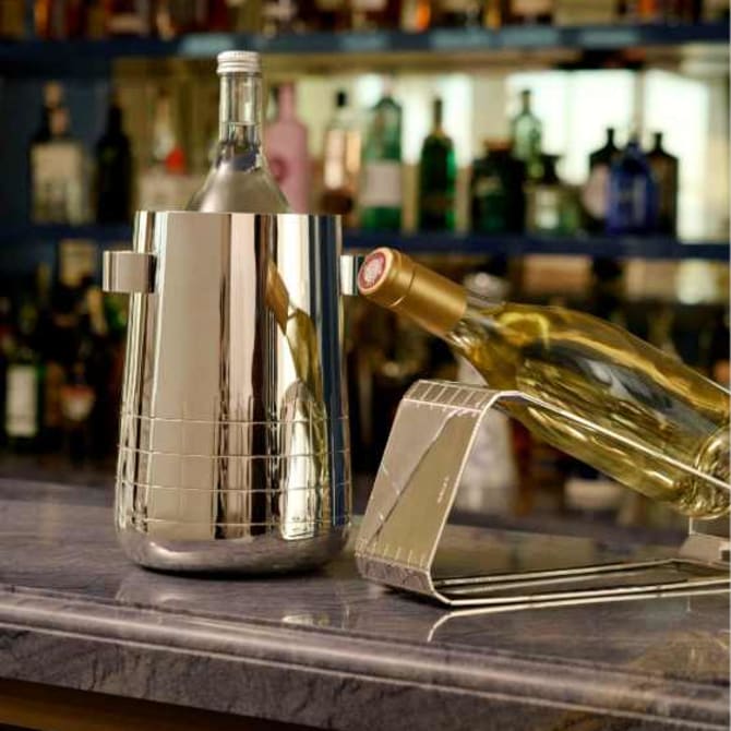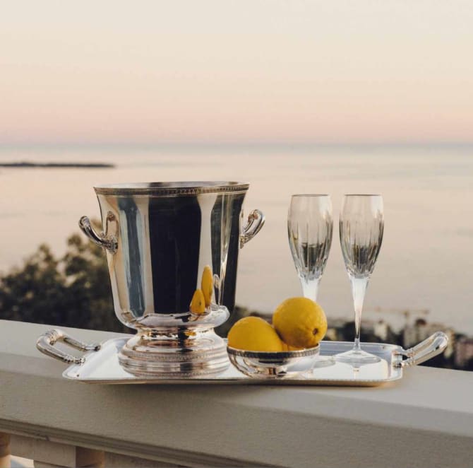 シャンパンヴァスク、シャンパンクーラー、およびサーベルを含む3アイテム限定コレクションです。クリストフルとエリオット・バーンズの貴重なコラボレーションの賜物であるこのコレクションは、卓越した美しいデザインによって個々が互いを引き立て合います。