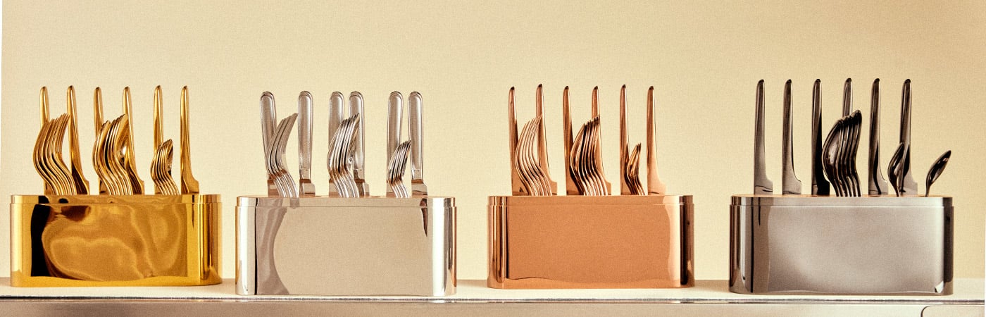 24本のステンレス製カトラリーをエレガントに納めたコンコルド。リラックスした陽気なひとときへの招待状のよう。いつでも簡単に使える気楽さでテーブルにいつも据えておくことができます。CONCORDE(コンコルド)は、アートを日常生活に取り入れていただきたいというメゾンの願いを体現する作品です。