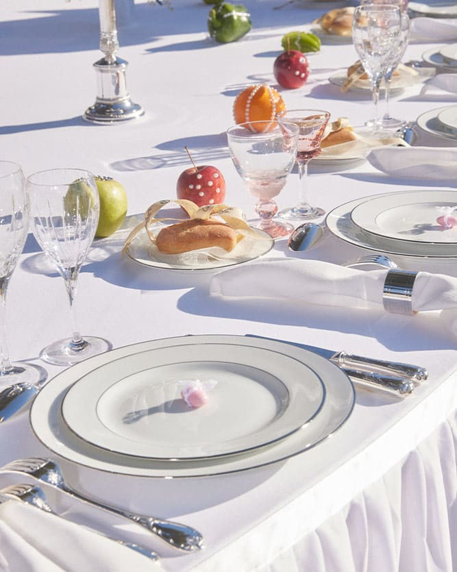 エレガントでラグジュアリーな夏のテーブルセッティングをお探しなら、「マルリー」コレクションがおすすめ。マルリー城の建築装飾を彷彿させる繊細で複雑な流れる文様が優雅さを演出します。時代を超越した洗練さが、ダイニングをより華やかに演出します。
