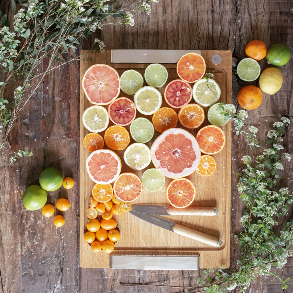 2. フルーツを半分にカットします。ライムとライムは自立するように底側もカットします。