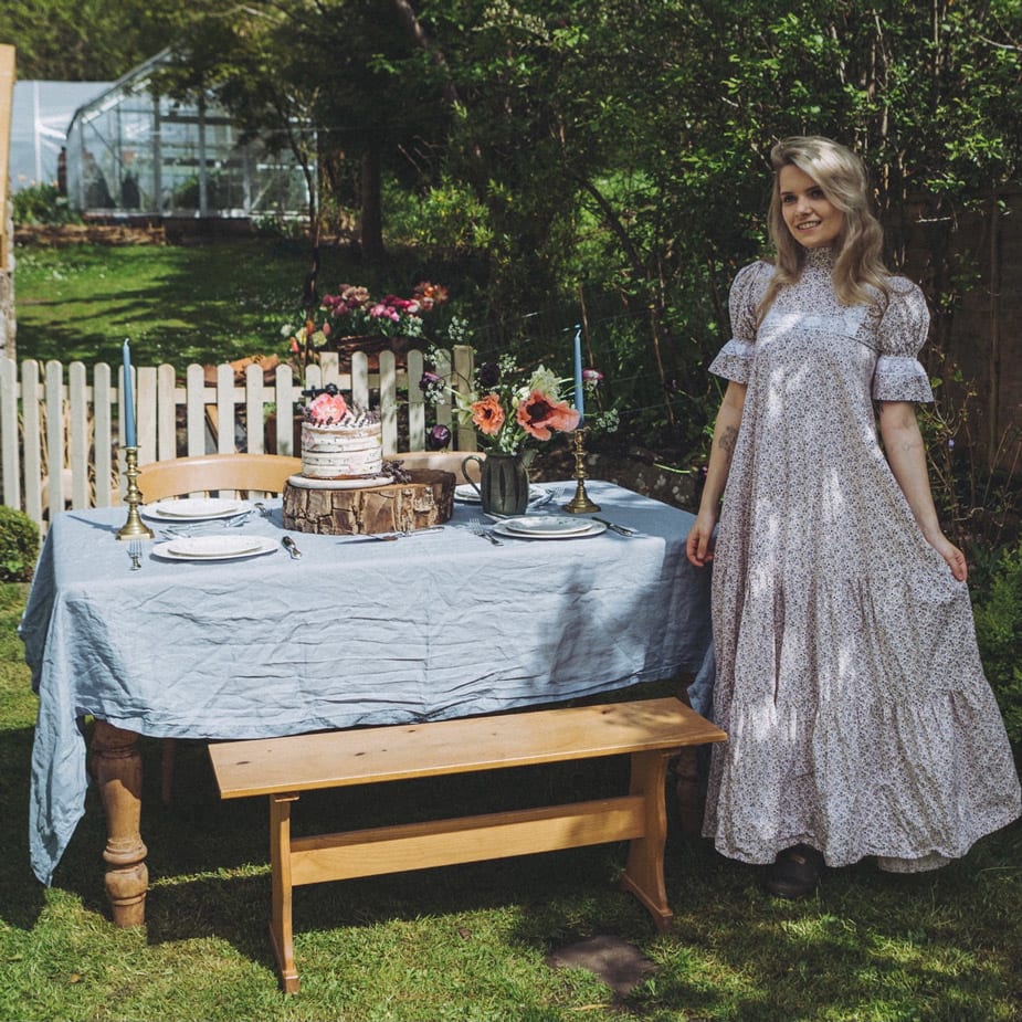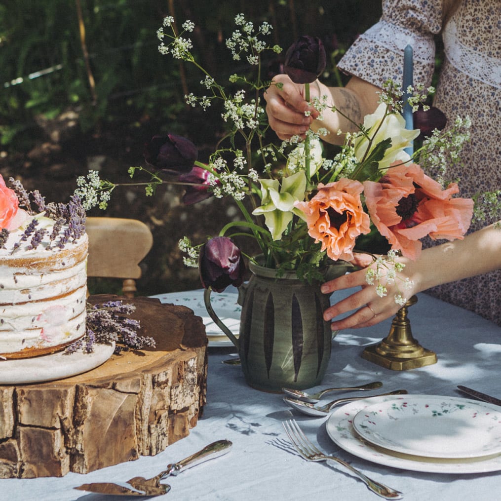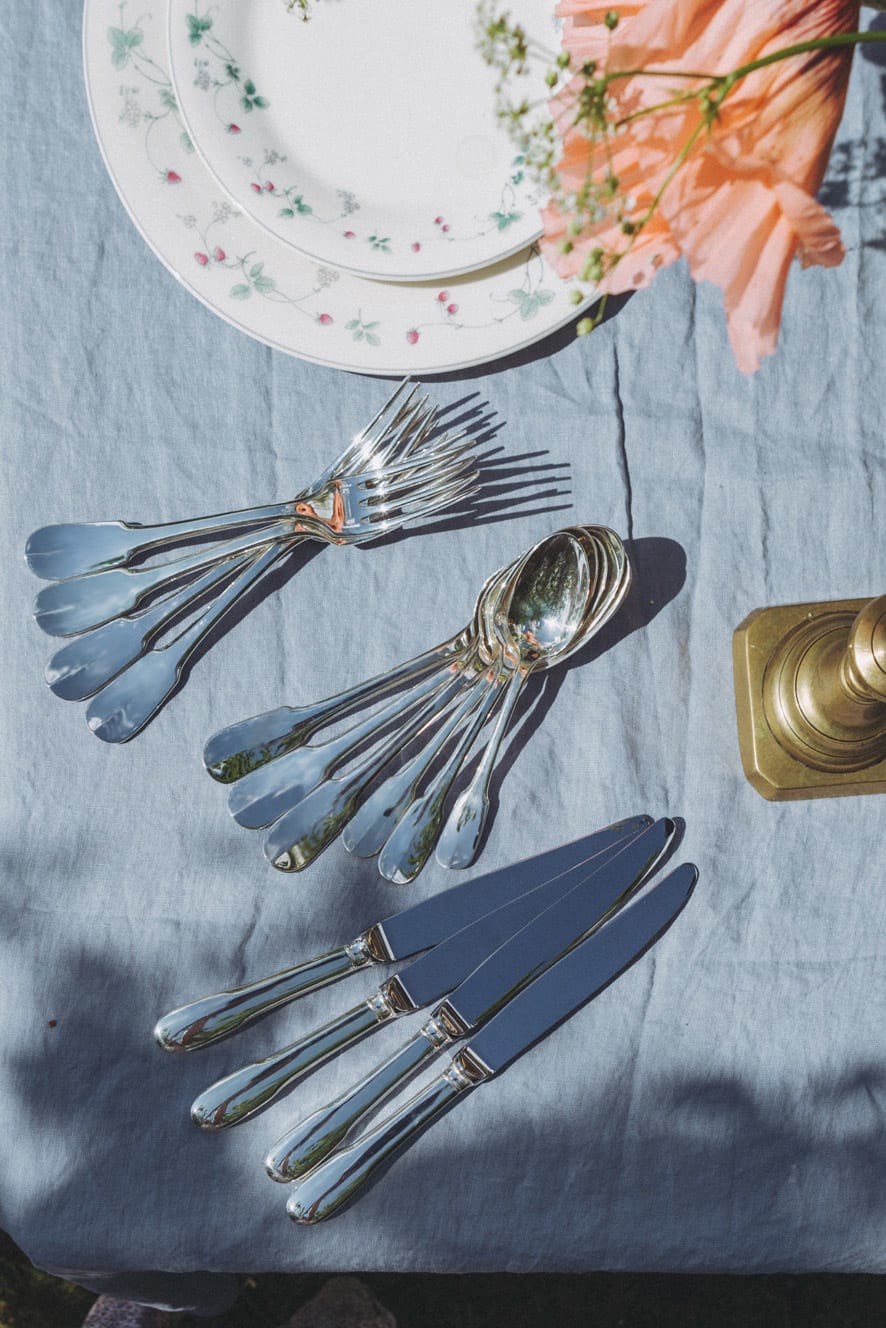 私はクラシックと古典の融合が好きなので、青いテーブルクロスと不思議の国のアリスを思わせる庭の設定を選びました。それらをクリストフルのクラシックなデザインのクリュニーコレクションと合わせました。