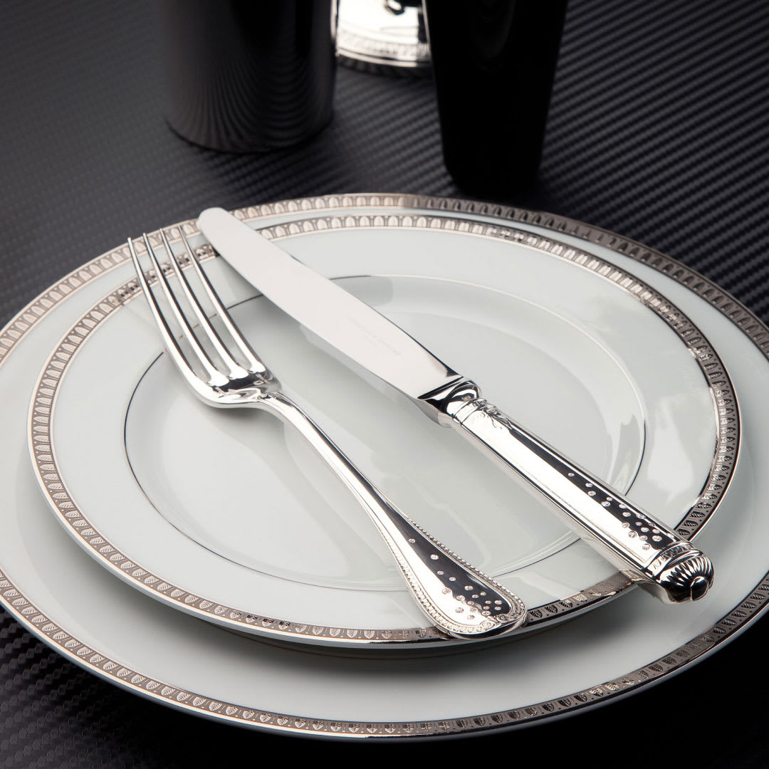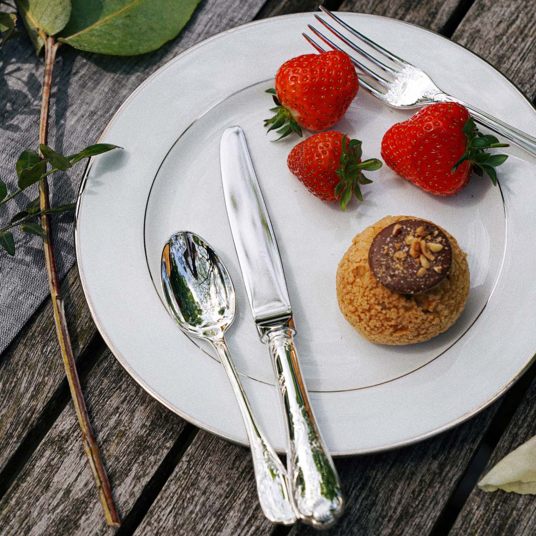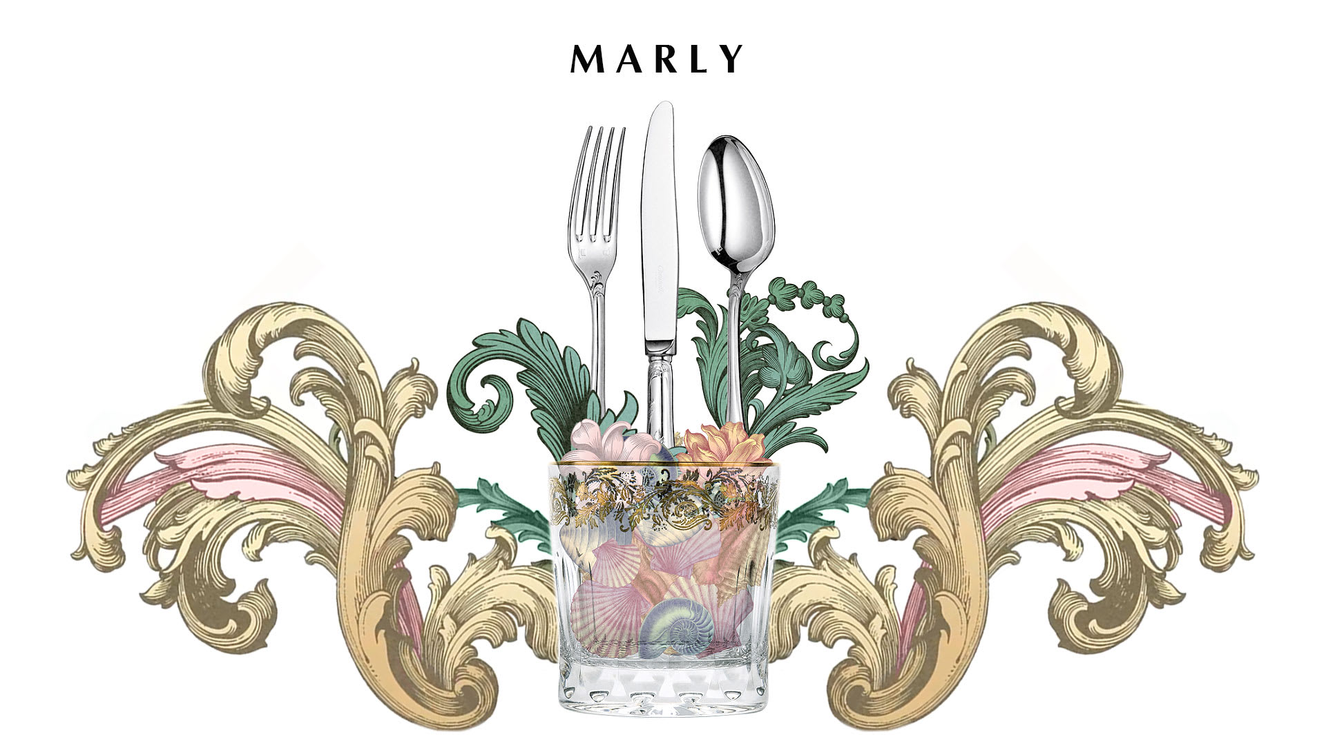 マルリーは、ルイ14世によってパリ近郊に建てられたマルリー城に由来しています。コレクションの中でも複雑な装飾が特徴で、フレンチテーブルスタイルの色彩の豊富さや優雅さを美しく表現しています。カトラリーのハンドル部分のふくよかなフォルムと装飾は、他のカトラリーにない贅沢感を与えてくれます。