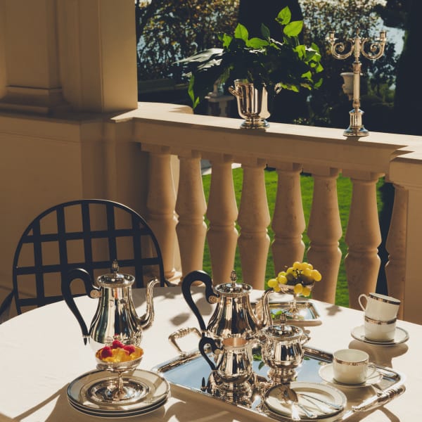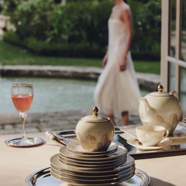 Reinterpreting the iconic codes of the Malmaison collection, Malmaison Impériale introduces a contemporary expression of Empire-style elegance. The emblematic palmette motif blooms at the center of the plates, while graphic rosettes create a rhythmic and refined composition. Available in gold or platinum finishes, the collection is designed to be mixed and matched, bringing harmony, sophistication and a modern spirit to every table setting.