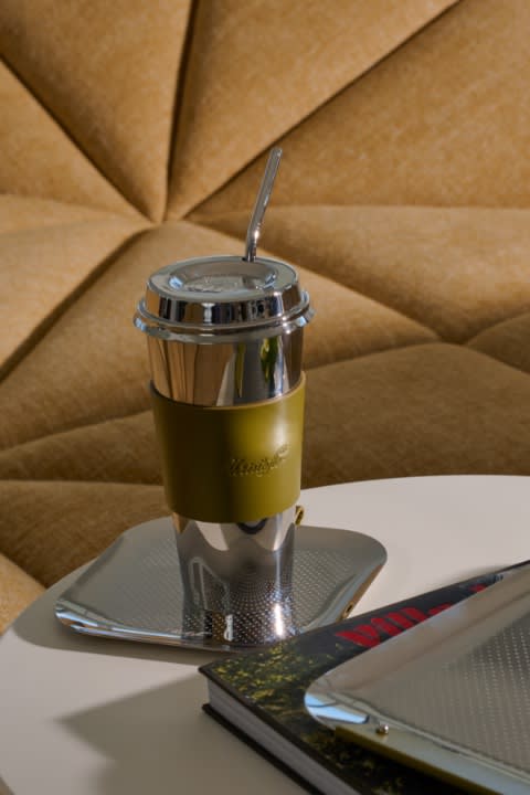 The morning after, Grace lounges on her Pierre Paulin couch, sipping coffee from her stainless steel Coffee cup, as sunlight refracts through her Haute Orfèvrerie Dellipse saber perched nearby.