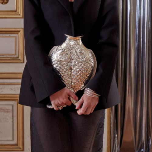 An essential classic of the maison, this fish-shaped vase is reissued in patinated silver metal (with a height of 33.5 cm), made for the first time in solid cast iron, without assembly, with particular care taken by the workshops at certain details like the eyes or the fins, to give it life and character.