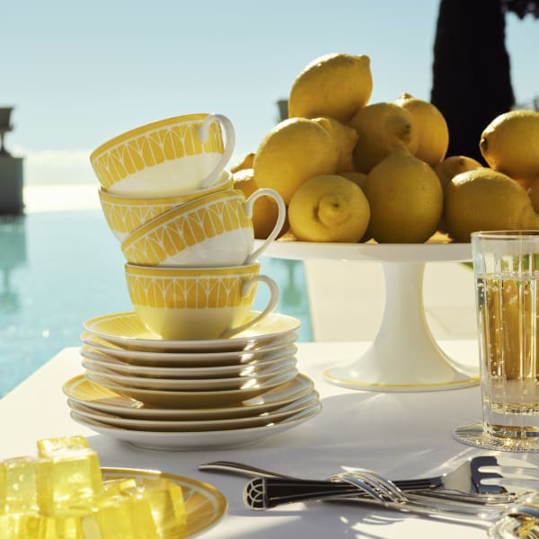 Each piece of the Malmaison Riviera service appears to capture the Mediterranean sun through a watercolor-like yellow, vibrant and natural, warming and illuminating the table.