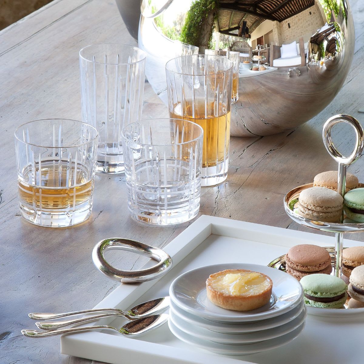 The Iriana Barware collection, designed by Studio Christofle in 1996, is known for its sober and elegant design. The collection includes a variety of crystal glassware, such as wine glasses, cocktail glasses, decanters, and an ice bucket. The vertical cut of the crystal enhances its purity and highlights the colors and sophistication of the drinks served.