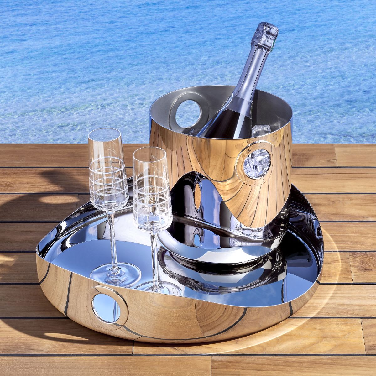 The OH collection by Christofle is crafted from stainless steel, combining style and functionality. Inspired by the nautical world, the collection features fluid lines and emblematic rings, reminiscent of sailboat eyelets. These pieces are perfect for both relaxing and entertaining outdoors.