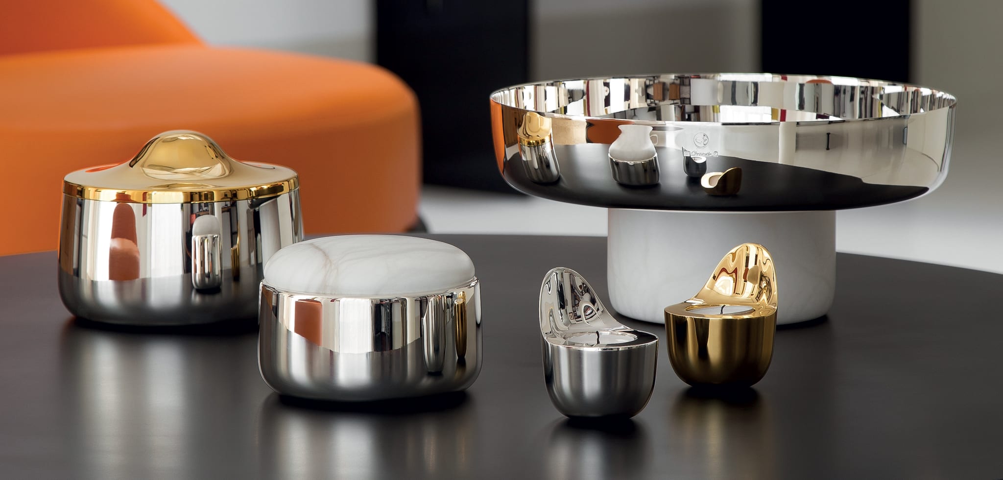 The Céleste collection designed by Eric Schmitt, entails structural and sensual forms in a surprising alliances between smooth and solid materials of silver, brass, alabaster and Borghini marble for the Haute Orfèvrerie pieces.