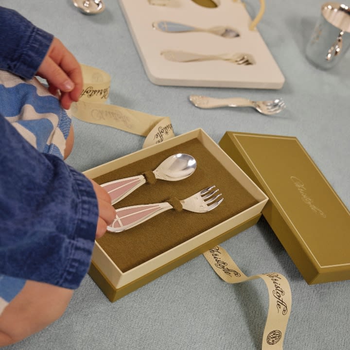 Talisman children's flatware is made from silver-plated metal and lacquer, ensuring both durability and elegance. The lacquered finish comes in various soft colors that appeal to children and parents alike.