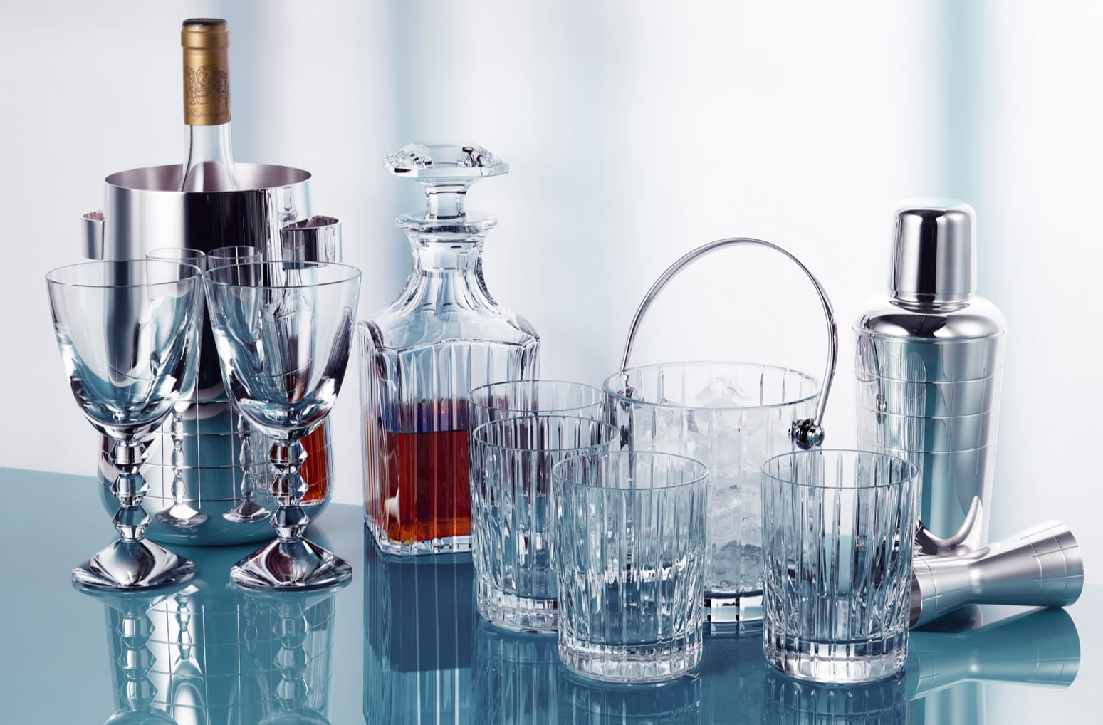 Christofle and Baccarat come together in perfect harmony with essential silver and crystal pieces to build a bar that is both elegant and functional.