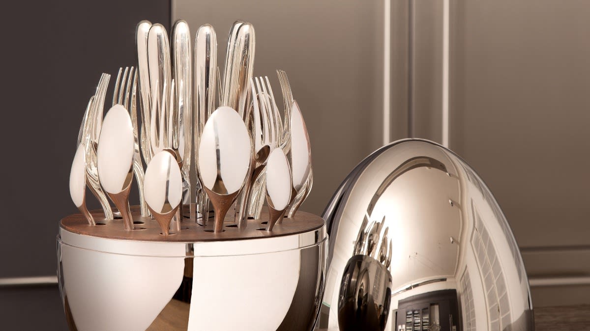 The Concorde case, available in steel, black, gold, and copper finishes, can be customized with flatware from five Christofle collections