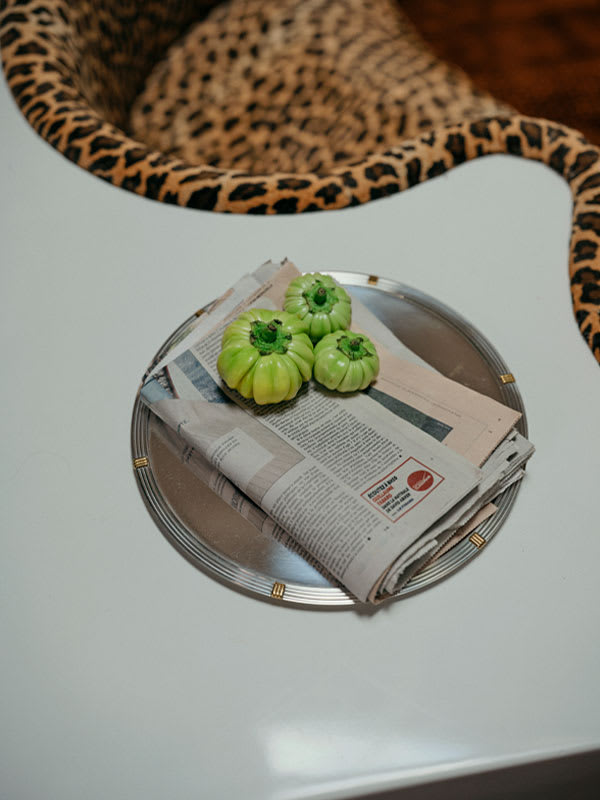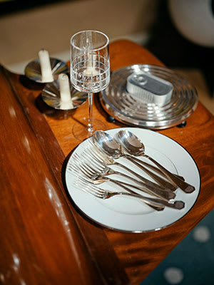 His aesthetic merges the elegance of the 1930s with the decadence of the 1980s, creating a unique lifestyle in which Christofle seamlessly fits. In his museum-like apartment, Christofe accompanies him from breakfast through to the anticipated gatherings he hosts, refecting his eclectic and dynamic existence.