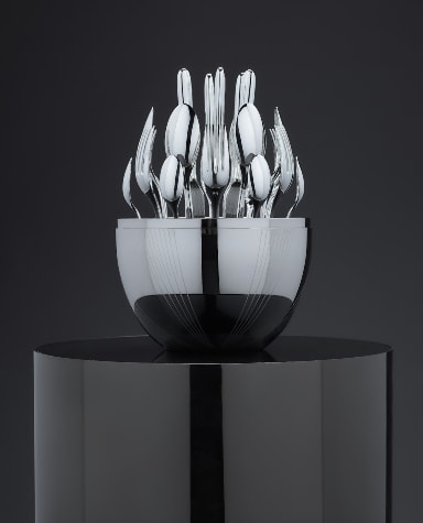Fashion luminary Karl Lagerfeld was a longtime collector of Christofle, as evidenced by numerous pieces featured in his estate sales at Sotheby’s in 2021. In 2018, shortly before his passing, Lagerfeld collaborated with Christofle on the brand's signature MOOD silverware set, imbuing the distinctive egg-shaped case and flatware with a graphic, Art Deco-inspired pattern rendered in mirror-polished silver and glossy black lacquer. Only 1,500 pieces were created—1,000 with a stainless-steel case and just 500 in black lacquer—and all sold out upon their release.