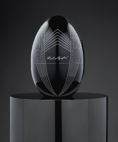 First introduced in 2015, the MOOD collection has become one of Christofle’s best-sellers. Conceived as both a decorative objet d’art and a functional set of silverware, MOOD is defined by a contemporary approach to entertaining—rather than setting the table, guests can select cutlery at their leisure. The flatware’s clean, modern silhouette give the collection considerable versatility. For his take on MOOD, Lagerfeld chose to engrave the cutlery with fine geometric lines, mirroring the design etched onto the ovoid case’s exterior, as well as a discreet emblem of the iconic designer’s profile.