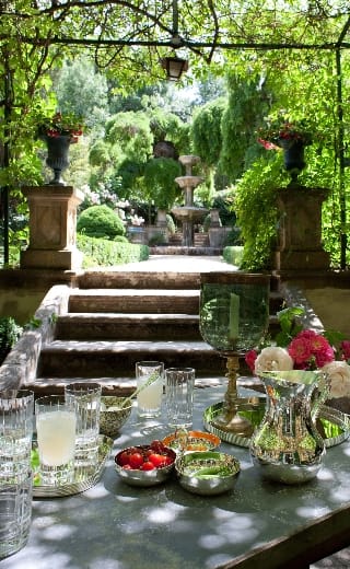 The iconic Mood is sure to shine on any garden party table, where it can rest on a hand-embroidered tablecloth, by French designer, Sarah Espeute.