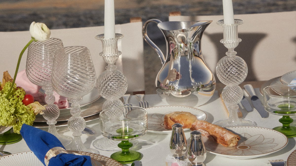 - Glassware: Christofle offers blown glass and crystal glass items, such as the Tourbillon Blown Glass Candlestick Set or the Graphik Crystal Wine Decanter, respectively.