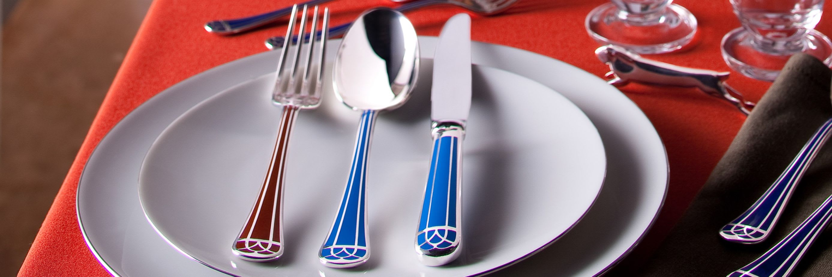 Talisman flatware is available in silver plated metal or gilded, matching all porcelain with colored fillets and some floral pattern.